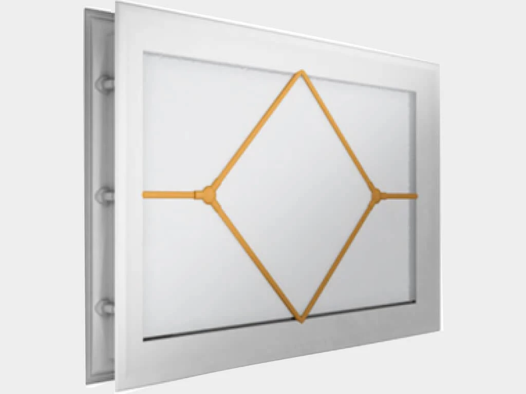 Окно акриловое 452 × 302, белое с раскладкой «ромб» (арт. DH85629). Специальная конструкция обеспечивает плотное прилегание к полотну ворот, что защищает его от промерзания и теплопотери. Стилистическая вставка в форме ромба. Окантовка белого цвета.